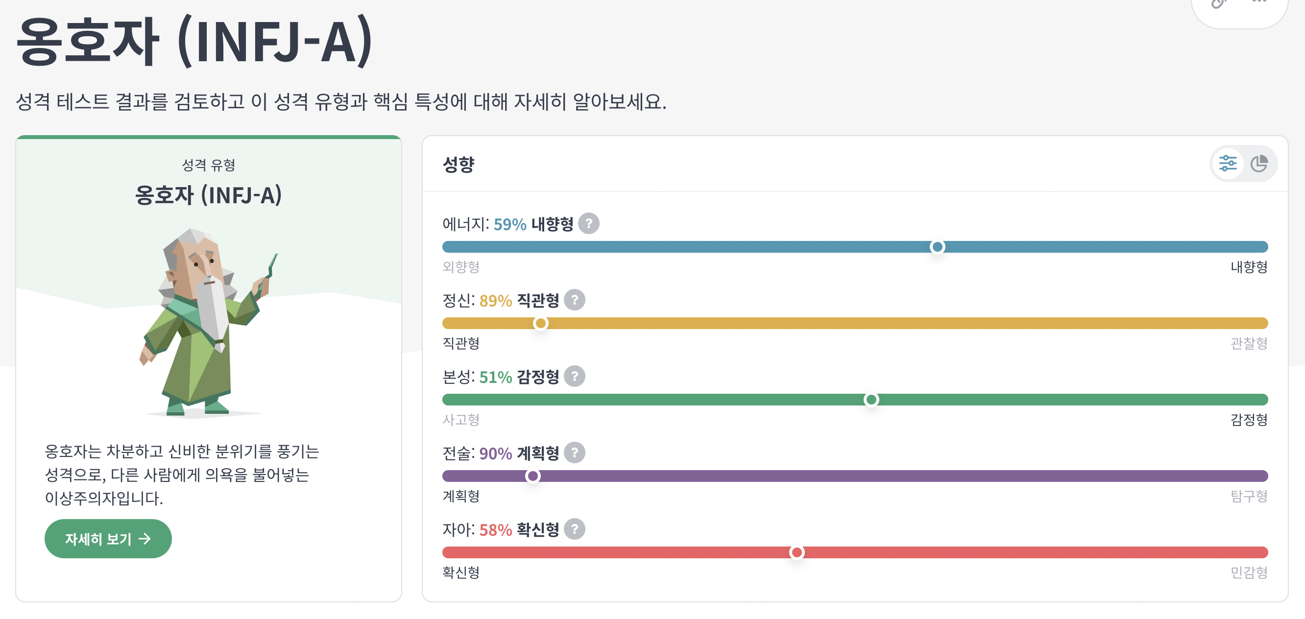 나는 그동안 MBTI성격 유형인 INFJ로 알고 있었는데 처음으로 INTJ가 나왔네... 헐... 많이 당황스럽다. 어쩐지 좀 그렇더라고 ㅎㅎㅎ 남을 돕고 싶어하지만 쓸데 없이 도와주는 건 또 안좋아하는데 이건 자꾸 이상하다고 생각했는데. 역시나 난 인티제(INTJ)인가? 인프제(INFJ)인가? 이건 좀 헷갈리네 MBTI검사 상 100번에 99번은 인프제(INFJ)인 걸로 나오는데 아주 미세하게 T와 F의 차이이니 음, 헷갈리는 구만